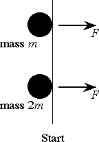| Figure 2. A top view of a "race" between two objects on a frictionless horizontal surface. The two objects are of different mass but are subjected to the same net force. When asked which object crosses the finish line with greater kinetic energy, only a few students were able to give the correct answer. |