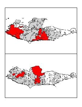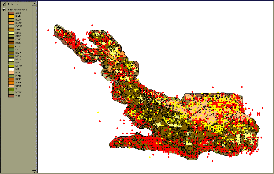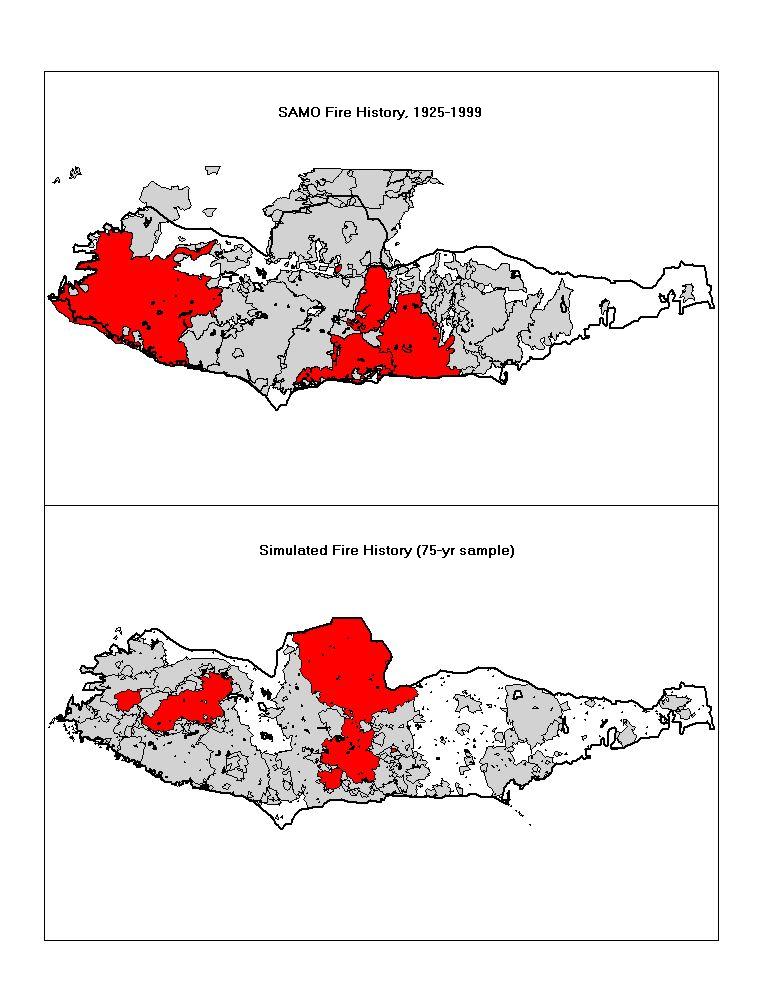 patterns: Both real and simulated fires are relatively compact and space-filling (as opposed to fractal). Both also show some of the same areas that tend not to burn very often. The real fire history for SAMO only records a few fires smaller than 100 ha, while the simulated output includes fires of all sizes. Fire