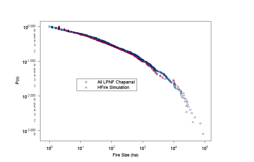 size distributions: Because the mapped fire history for SAMO is quite short and incomplete, it was not useful for this step in the validation process. As was the case for ignitions (above), the mapped fire history of LPNF was used in assessing the baseline simulation settings. Select the figure below to see a comparison between simulated fire size distributions and those characterizing historical data. Simulated fire regimes approximate those observed in real shrublands to a remarkable degree.