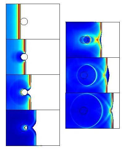 Figure 1: Consecutive snapshots (top to bottom) of the fault plane, showing a rupture breaking through a high strength barrier. The color scale measures slip velocity (warm colors mean faster sliding), and is renormalized in each snapshot. The rupture propagates to the right and is initially delayed by the barrier (which requires four times more energy to break than the surrounding fault). In contrast to what might be expected, the rupture actually shoots forward ahead of where it would have been in the absence of any perturbation! This is clearly shown in the middle image of the right column. Why does the rupture temporarily speed up? The answer lies in understanding the effect of rupture front curvature. As described previously , the region behind the rupture front where the stress is released is the source of elastic waves. These waves diffract off of the moving crack edge. If the crack edge is curved, then the waves become focused.This is illustrated for a simple crack edge geometry in Figures 2 and 3 below.