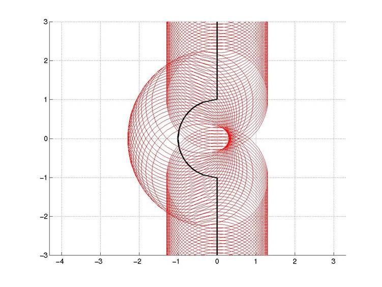 Figure 2: Consider an increment of crack growth when the crack edge is locally concave. Each point behind the crack edge is a source of elastic waves, each of which is represented with a red circle (wave velocity is assumed isotropic for simplicity and only one wave type is shown). Focusing toward the center of the barrier is evident.