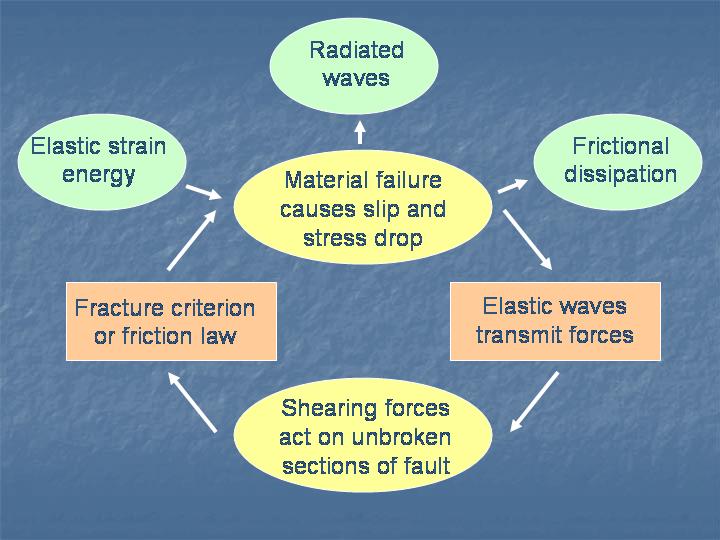Figure 4: The dynamic rupture process. The green bubbles show the flow of energy within the system. The yellow and orange boxes show the process by which the energy conversion occurs. Questions? E-mail Eric Dunham |
