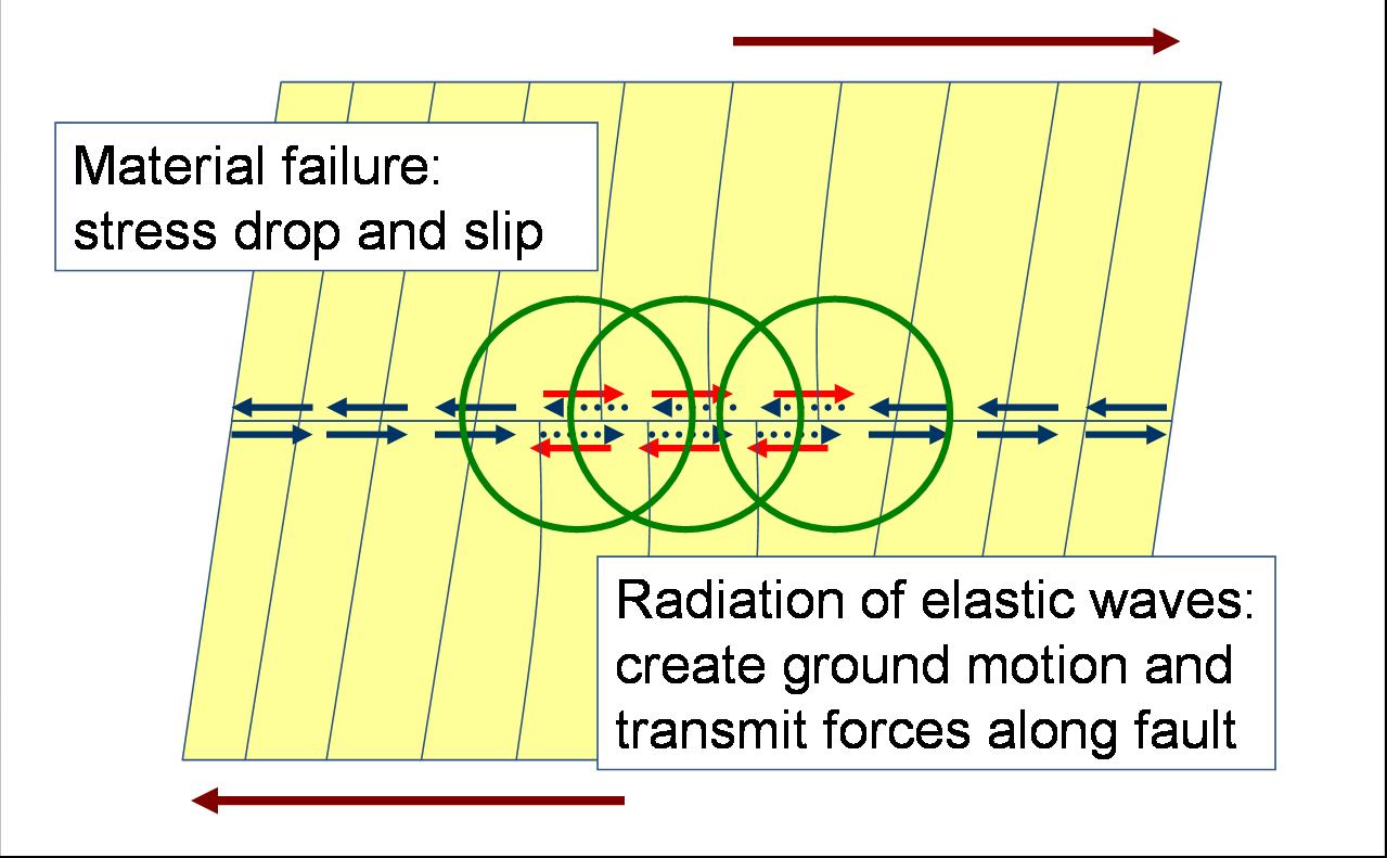 Figure 3: Material in the fault zone fails (or static friction is exceeded) and the fault begins to slip. Physically, we can view this process as the application of shear forces on the fault that negate the static friction, as represented by the red arrows. This releases elastic waves, indicated by the expanding green circles. Some of these elastic waves radiate away to generate the ground shaking we experience, while others travel along the fault to the locked region ahead of the crack edge. These waves carry the shearing force to the locked section and drive it toward failure. In this way, the crack expands at a velocity comparable to the speed of elastic waves, about 4-6 km/s! That’s a good deal faster than the rate at which the plates move. As you can see, this process is cyclical, and can lead to a rapidly expanding rupture (see Figure 4).