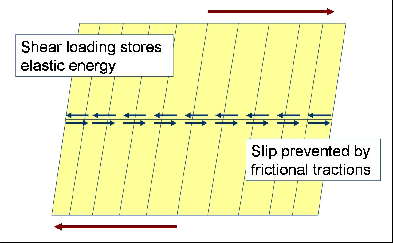 Figure 2: Top view of the geometry shown in Figure 1. The fault is the horizontal line through the center, with the blue arrows representing frictional forces that keep the sides of the fault locked. The slanted vertical lines indicate the shear displacements created by tectonic loading. At some critical level, the force on the fault will exceed the static frictional force, and the two sides will start to slide with some dynamic frictional resistance (less than the frictional value). From a fracture point of view, there is a cohesive force that exists between the two sides of the fault, and the stress must be large enough to overcome this. The discontinuity in the relative displacement is called slip. When this process occurs rapidly, it converts some part of the released strain energy into seismic waves (see Figure 3).