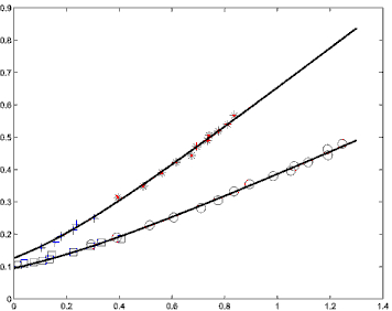 Figure 3: Data from simulations and fit from STZ