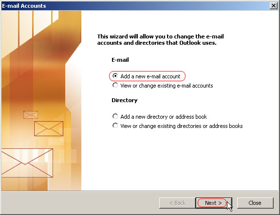 In the E-mail Accounts wizard select Add a new e-mail account and then click Next.