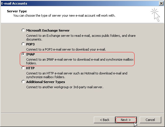 For your server type select IMAP and then click Next.