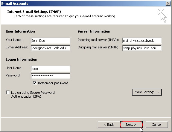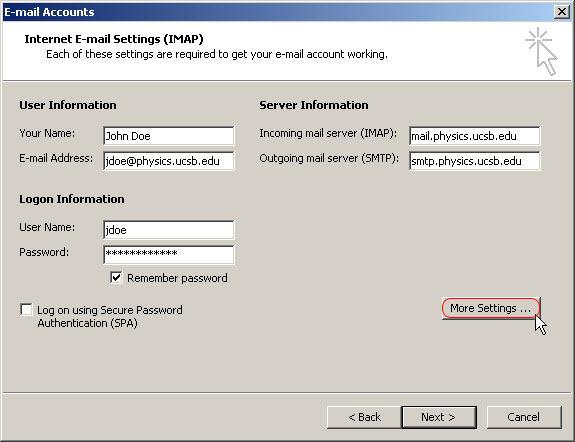 In Internet E-Mail settings fill in your information as shown in the screenshot below. You should enter in your name, e-mail address, user name, and password instead of filling in John Doe's information. For the Incoming mail server you should enter "mail.physics.ucsb.edu" and for the Outgoing mail server you should enter "smtp.physics.ucsb.edu" after you have done all that click More Settings... .