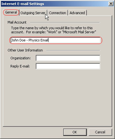 In Internet E-Mail settings under the General tab you can label your Mail Account, after you do that click on the Outgoing Server tab.