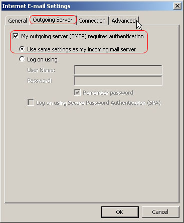 In Internet E-Mail settings under the Outgoing Server tab check My outgoing server (SMTP) requires authentication and select Use same settings as my incoming mail server, then select the Advanced tab.